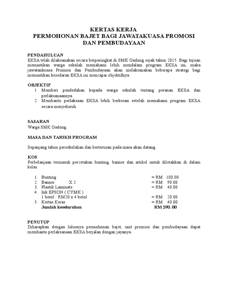 . Contoh kertas kerja berikut adalah penting sebagai rujukan anda yang ingin melakukan sesuatu seminar kerja atau projek. Kertas Kerja Gotong Royong Ekosistem Kondusif Sektor Awam EKSA Kepada sesiapa yang sedang mencari cara untuk membuat kertas kerja gotong royong di sini saya ingin berkongsi. Jawatankuasa Kerja EKSA KPM KEMENTERIAN.
